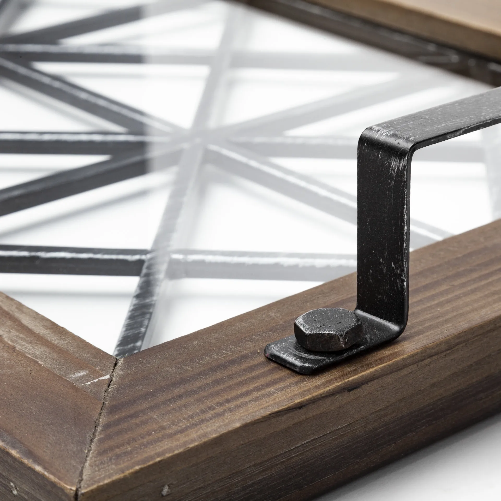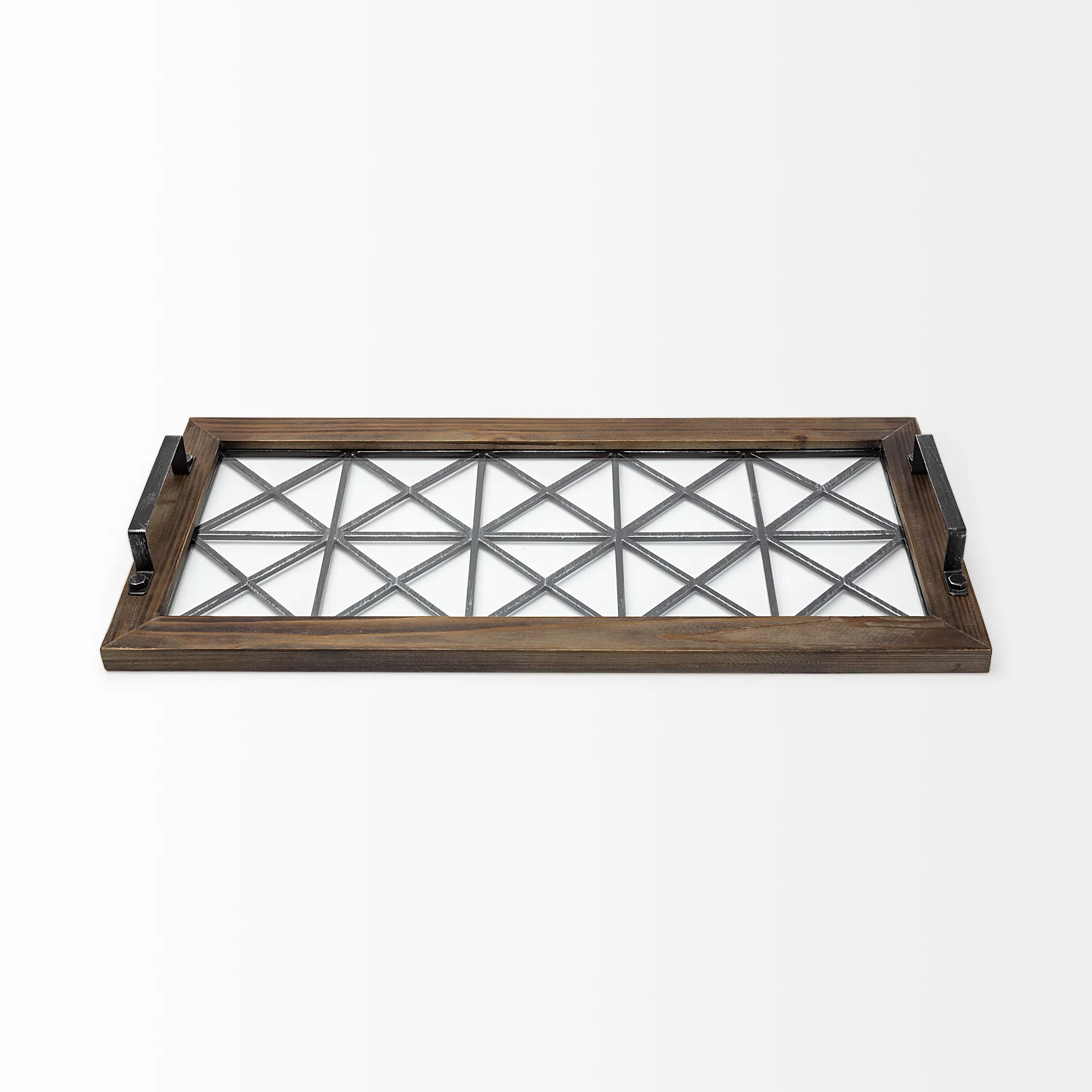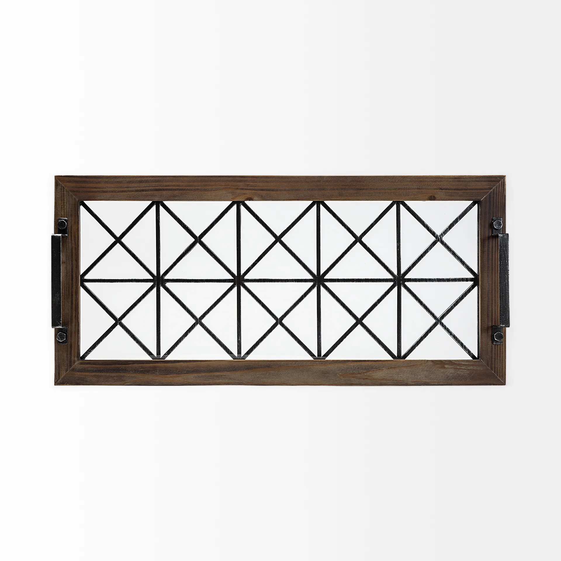Meticulously crafted from metal, glass and wood, the Ellingson is a stunning rectangular mirror that is just as functional as it is visually interesting. The Ellingson has a wood and metal frame and flaunts a clear-glass bottom that reveals a geometrically appealing pattern on the metal frame. It is also equipped with two handles on the sides for convenient hauling of small items. A unique juxtaposition of metal, glass, and wood makes the Ellingson a great fit for spaces based on the Mercana Modern, Industrial, Woodlands and Farmhouse design styles.