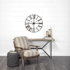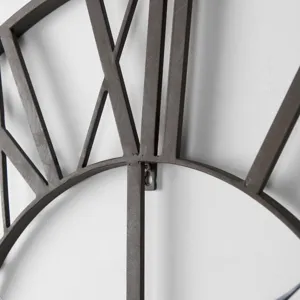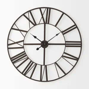 This classic style wall clock features an open design with large, cut-out Roman Numerals encircled by a solid iron frame. The Roman Numerals are constructed from iron, as is the round center dial with spade style hands.