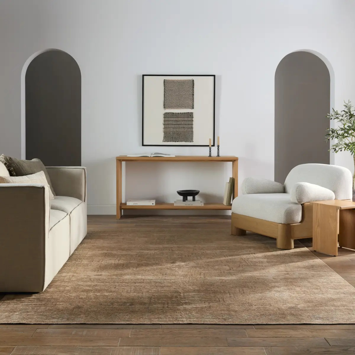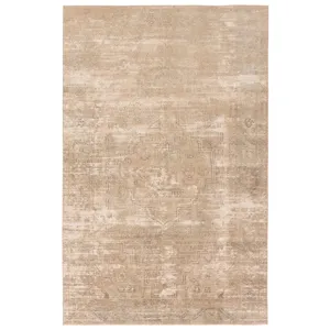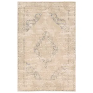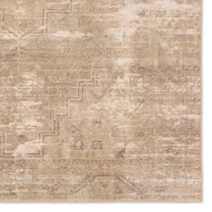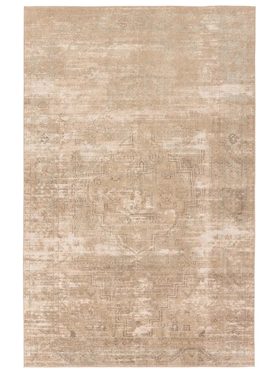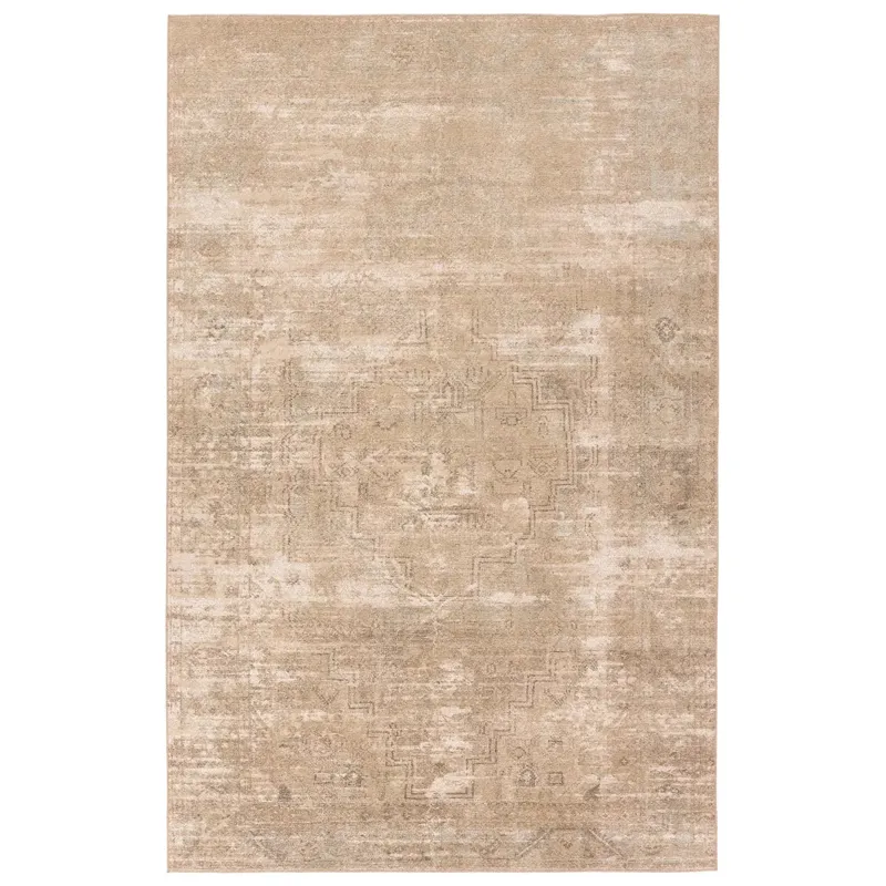 The innovative Edage rug collection showcases distressed, vintage designs, digitally printed onto a jute and polyester base. This process provides effortless texture and natural appeal through the jute weave, while maintaining an elevated feel through updated traditional patterns. The Leshni design showcases a vintage-inspired, center medallion pattern in hues of tan, sage, dark brown, and cream. This rug best suits medium to low traffic spaces of the home such as formal dining areas, bedrooms, formal dining areas, and sitting rooms.