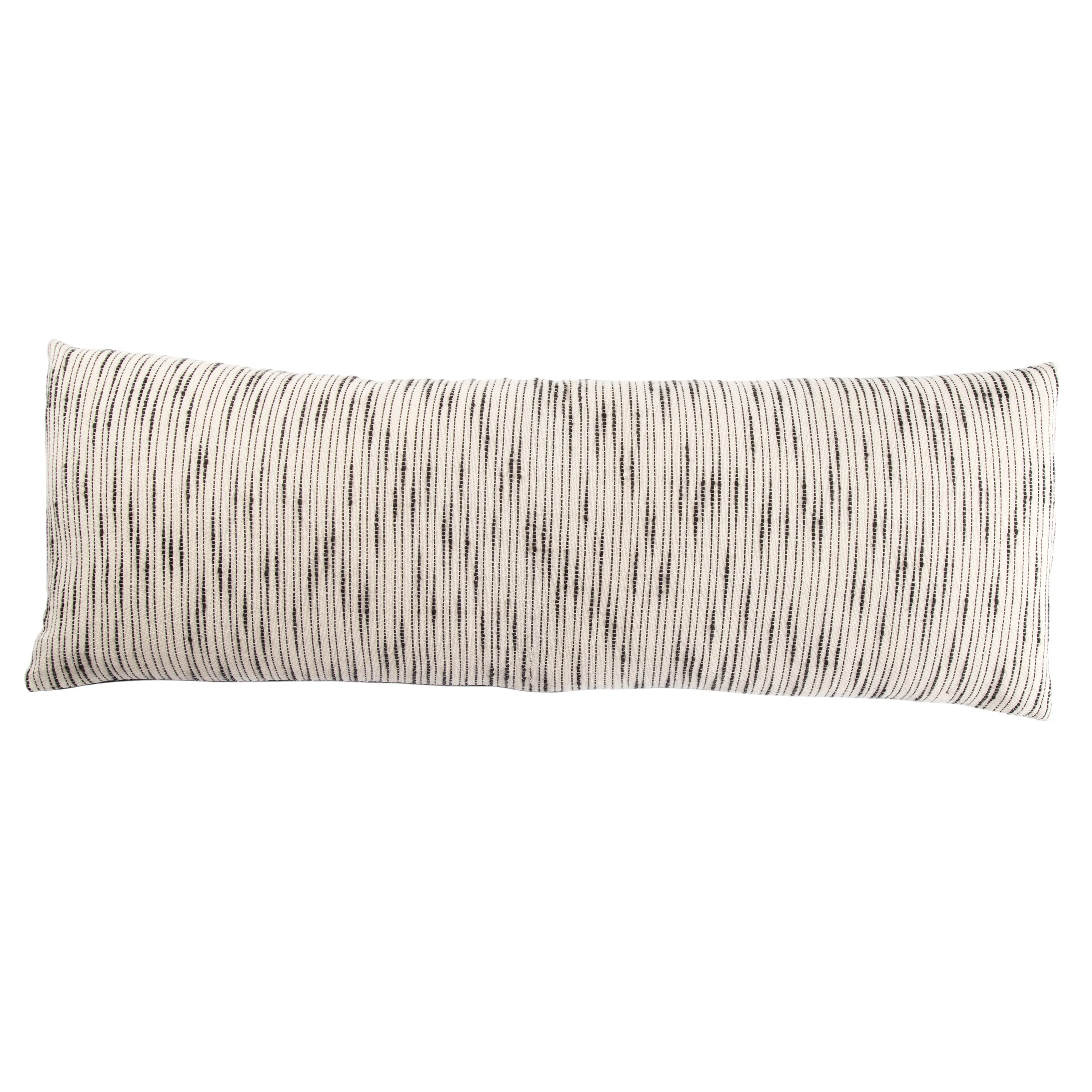The Mercado pillow collection marries bohemian charm and irresistible texture. The Linnean lumbar pillow is crafted of soft cotton, featuring a stitched linear design that recalls a traditional raw silk look. In contrasting charcoal gray and ivory, this plush accent complements a range of stylish spaces.