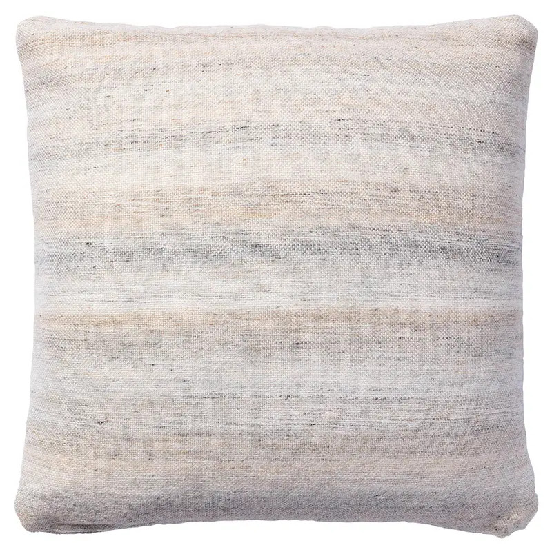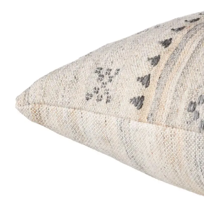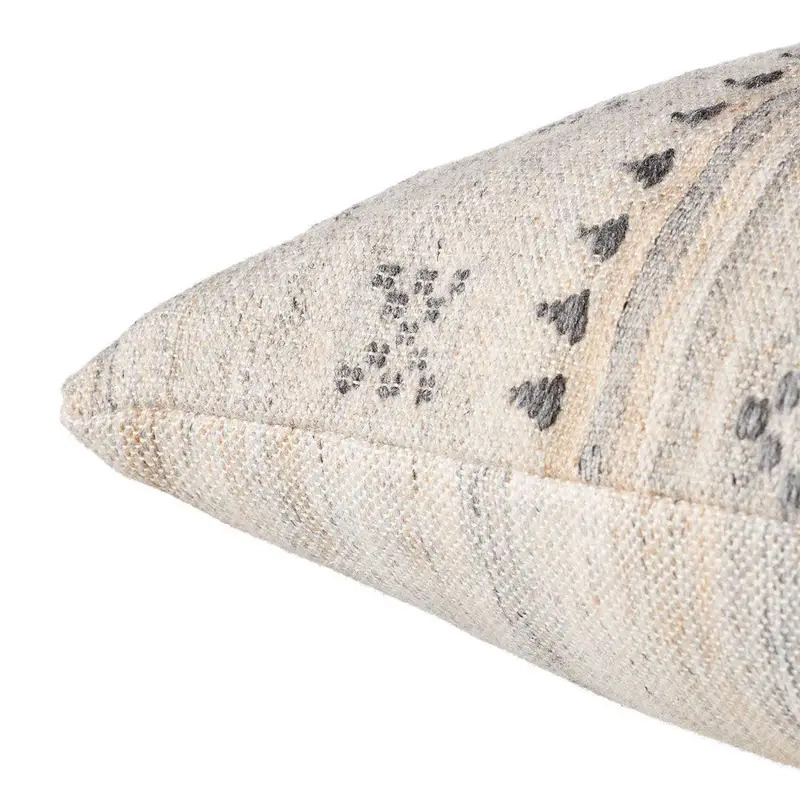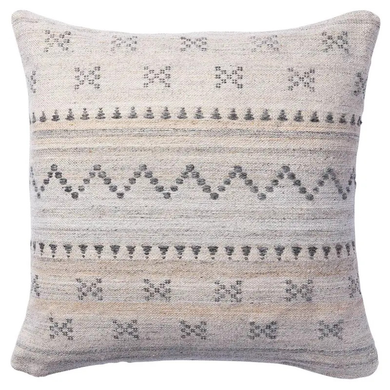 The handmade Lakashi throw pillow features intricate, gray embroidery on a heathered cream, gray, and beige base. The tribal detailing provides a global style that suits any indoor or outdoor space. The 100% PET fibers are water, stain, and fade resistant, making the perfect accent piece for homes with children and pets.