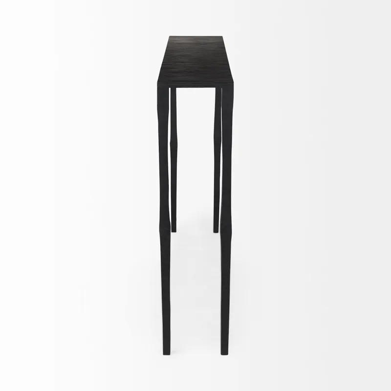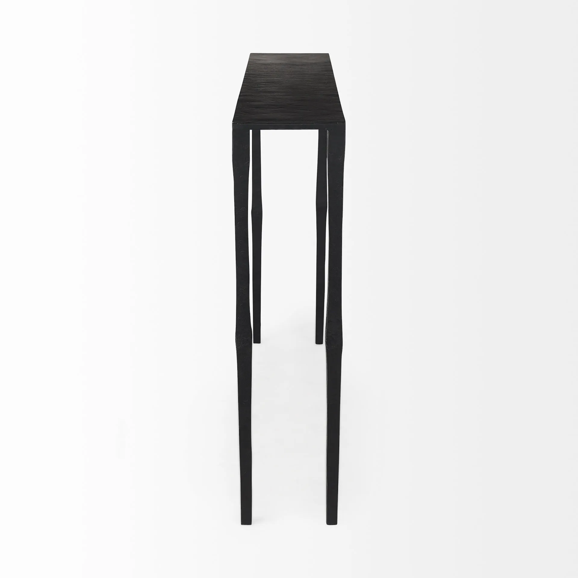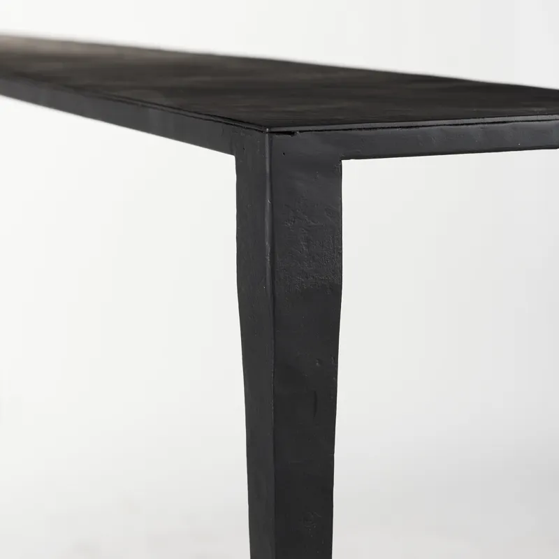 The Timothy is a rectangular console table measuring 48.5" long by 8.0" wide by 30.0" high. The Timothy is crafted from solid iron, that is durable and sturdy in nature. The Timothy is finished in a dark ebony black color, which adds visual contrast to a room. Fine divots and texture can be found on the console table, giving visual interest to the table and adding to the industrial look and feel. The Timothy has an industrial inspired design to it, with its dark profile and textured surface.