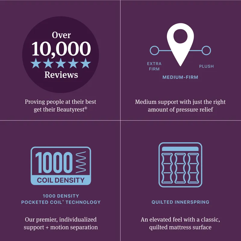 Step up to a world class sleep experience with our premier individualized support + motion separation, breathability and cooling, and responsive pressure relief with a classic, quilted surface.